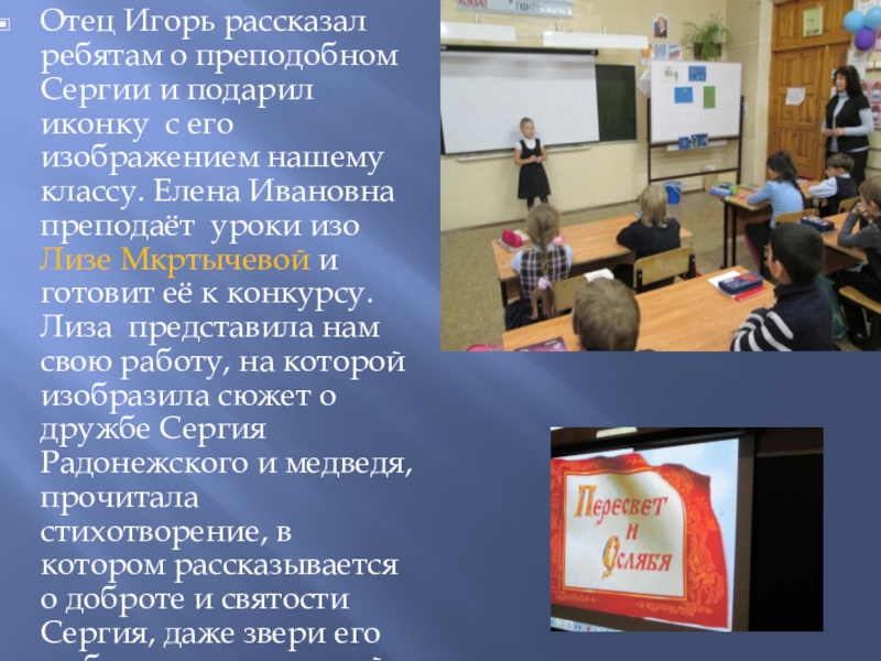 его изображением нашему классу. Елена Ивановна преподаёт уроки изо Лизе Мкртычевой и готовит её к конкурсу. Лиза представила нам свою работу, на которой изобразила сюжет о дружбе Сергия Радонежского и медведя, прочитала стихотворение, в котором рассказывается о доброте и святости Сергия, даже звери его не боялись, а он зверей.