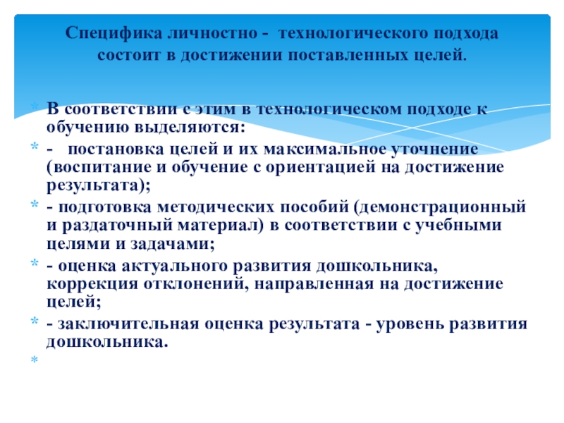 Специфика личностно - технологического подхода состоит в достижении поставленных целей.