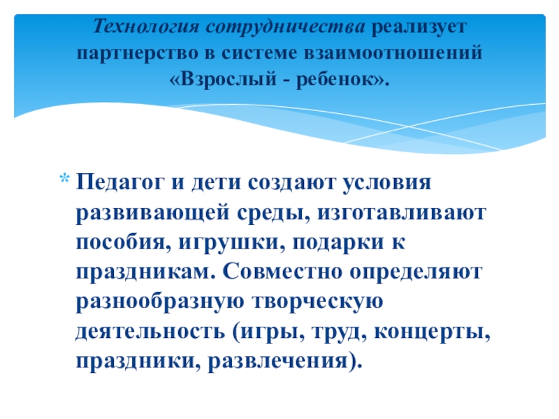 Технология сотрудничества реализует партнерство в системе взаимоотношений «Взрослый - ребенок».