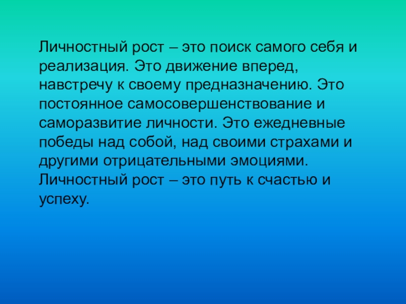 вперед, навстречу к своему предназначению. Это постоянное самосовершенствование и саморазвитие личности. Это ежедневные победы над собой, над своими страхами и другими отрицательными эмоциями. Личностный рост – это путь к счастью и успеху.