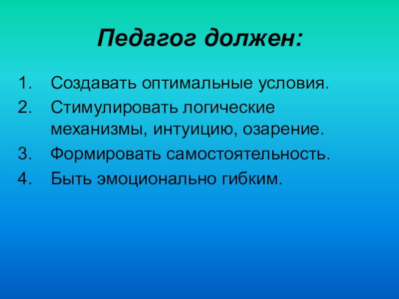 Педагог должен:Создавать оптимальные условия.Стимулировать логические механизмы, интуицию, озарение.Формировать самостоятельность.Быть эмоционально гибким.
