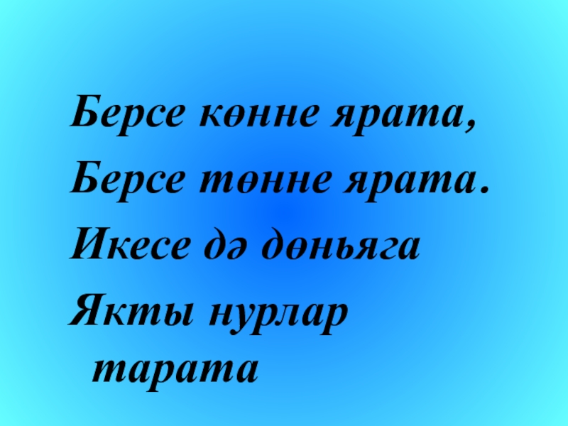 Берсе көнне ярата,Берсе төнне ярата.Икесе дә дөньягаЯкты нурлар тарата