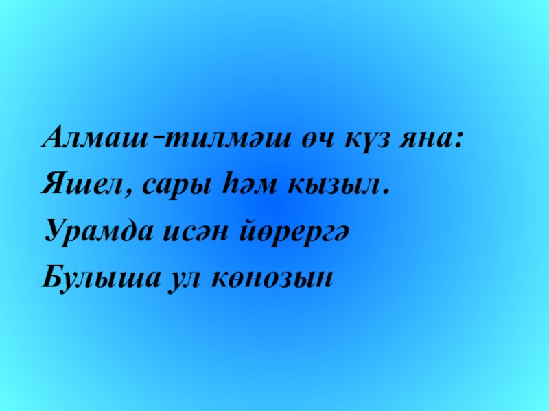 Алмаш-тилмәш өч күз яна:Яшел, сары һәм кызыл.Урамда исән йөрергәБулыша ул көнозын