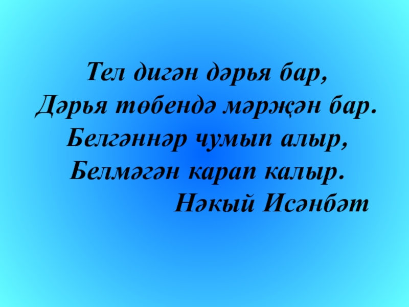 Слайд 7 Тел дигән дәрья бар, Дәрья төбендә мәрҗән бар. Белгәннәр чумып