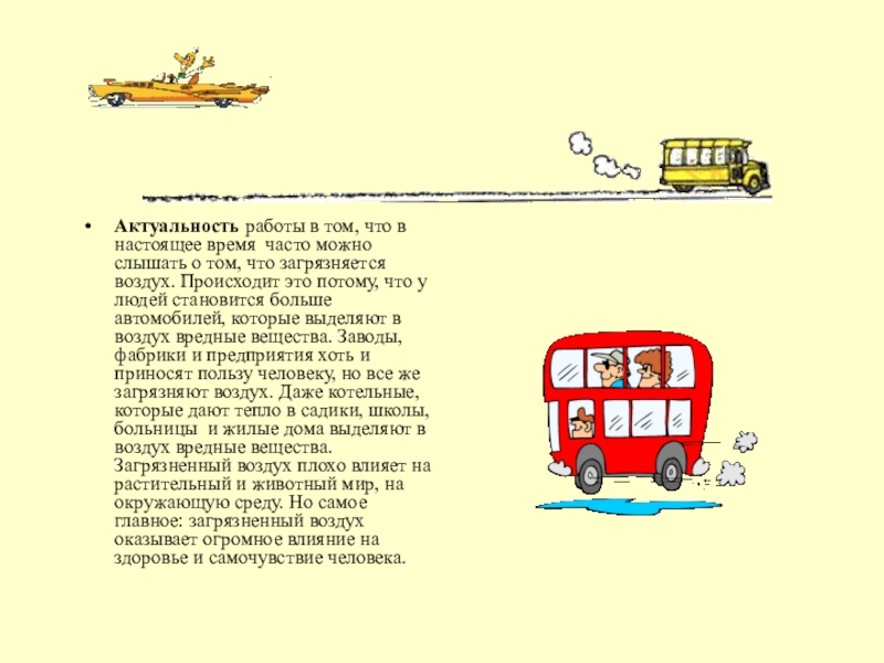 о том, что загрязняется воздух. Происходит это потому, что у людей становится больше автомобилей, которые выделяют в воздух вредные вещества. Заводы, фабрики и предприятия хоть и приносят пользу человеку, но все же загрязняют воздух. Даже котельные, которые дают тепло в садики, школы, больницы и жилые дома выделяют в воздух вредные вещества. Загрязненный воздух плохо влияет на растительный и животный мир, на окружающую среду. Но самое главное: загрязненный воздух оказывает огромное влияние на здоровье и самочувствие человека.