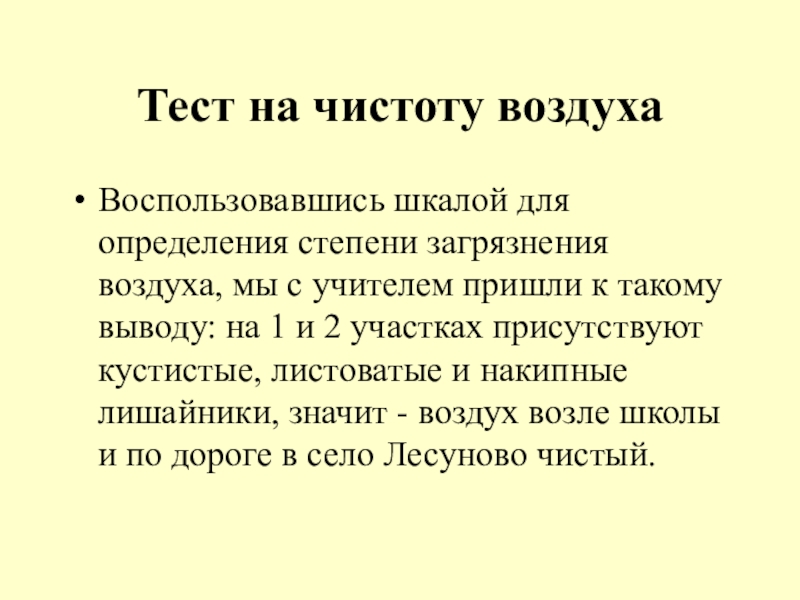 с учителем пришли к такому выводу: на 1 и 2 участках присутствуют кустистые, листоватые и накипные лишайники, значит - воздух возле школы и по дороге в село Лесуново чистый.