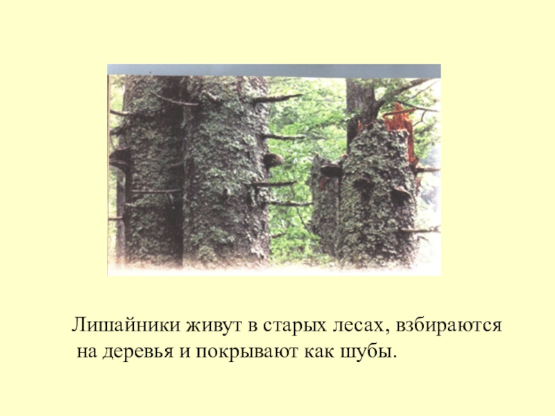 Слайд 9 Лишайники живут в старых лесах, взбираются на деревья и
