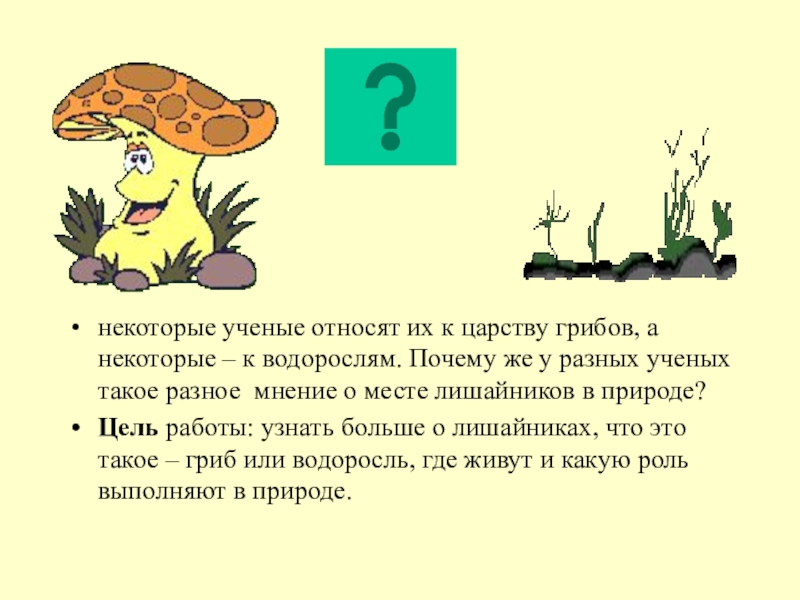 Цель работы: узнать больше о лишайниках, что это такое – гриб или водоросль, где живут и какую роль выполняют в природе.
