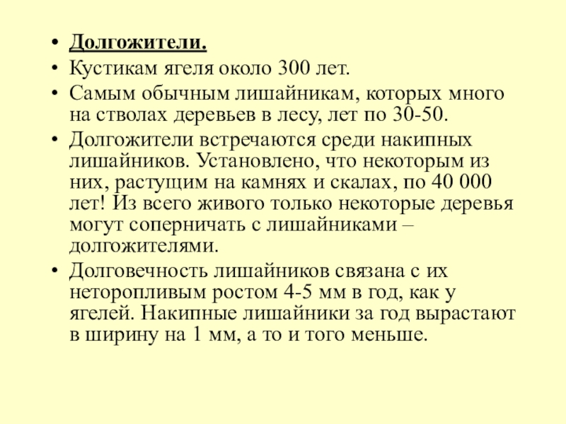 Долгожители встречаются среди накипных лишайников. Установлено, что некоторым из них, растущим на камнях и скалах, по 40 000 лет! Из всего живого только некоторые деревья могут соперничать с лишайниками – долгожителями.