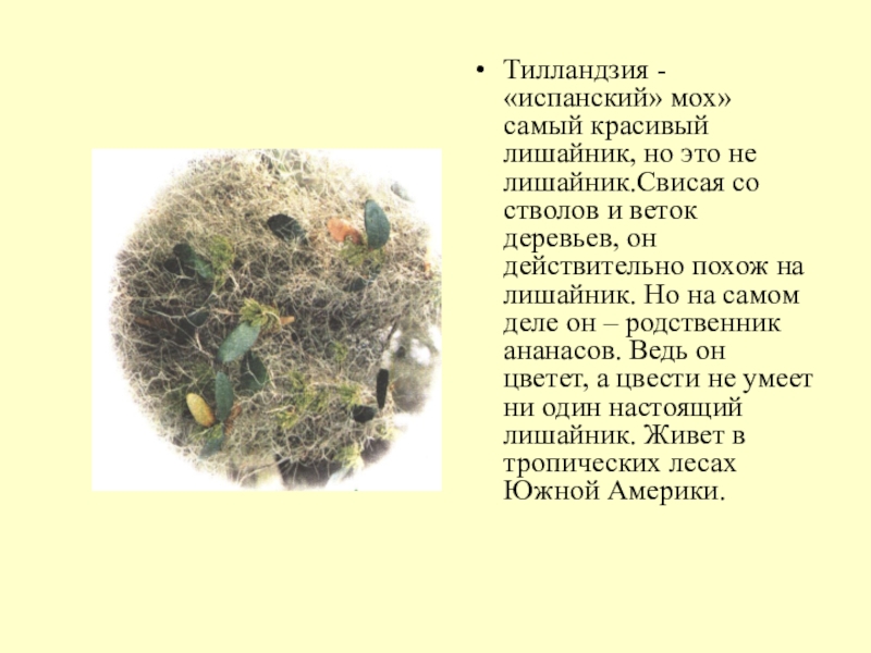 Слайд 8Тилландзия - «испанский» мох» самый красивый лишайник, но это не лишайник.Свисая