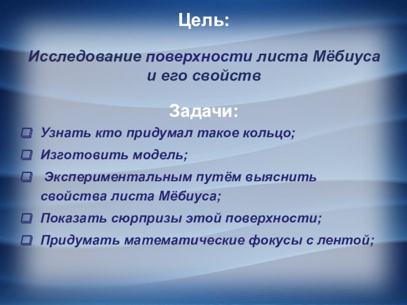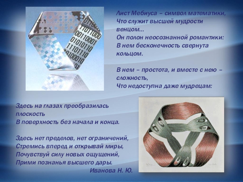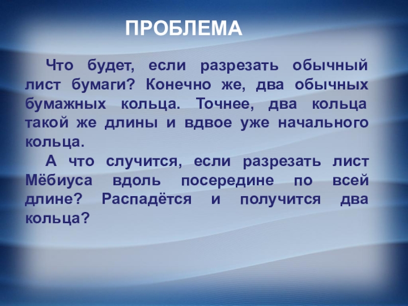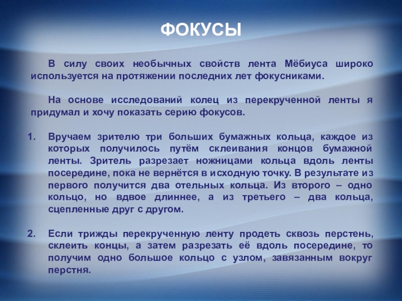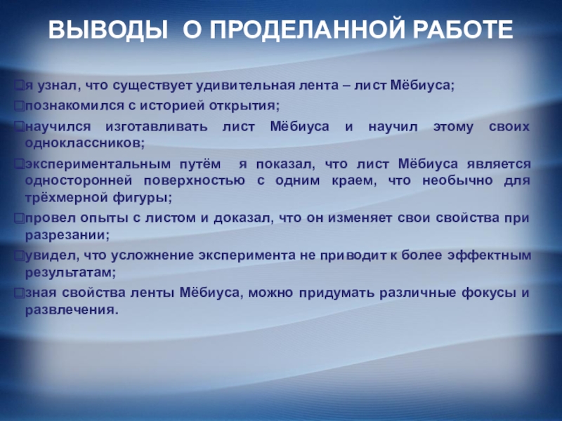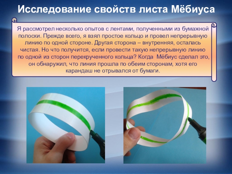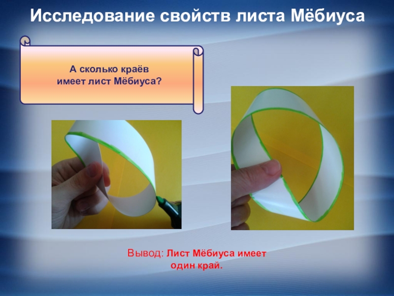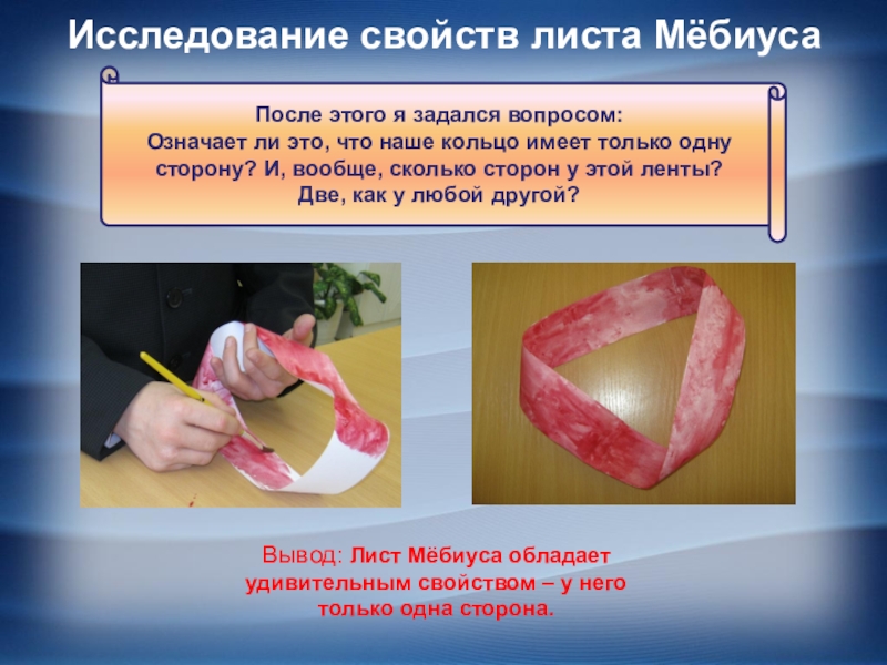 Вывод: Лист Мёбиуса обладает удивительным свойством ‒ у него только одна сторона.