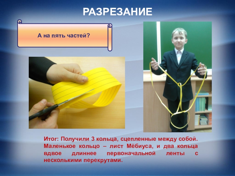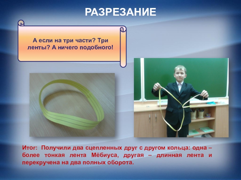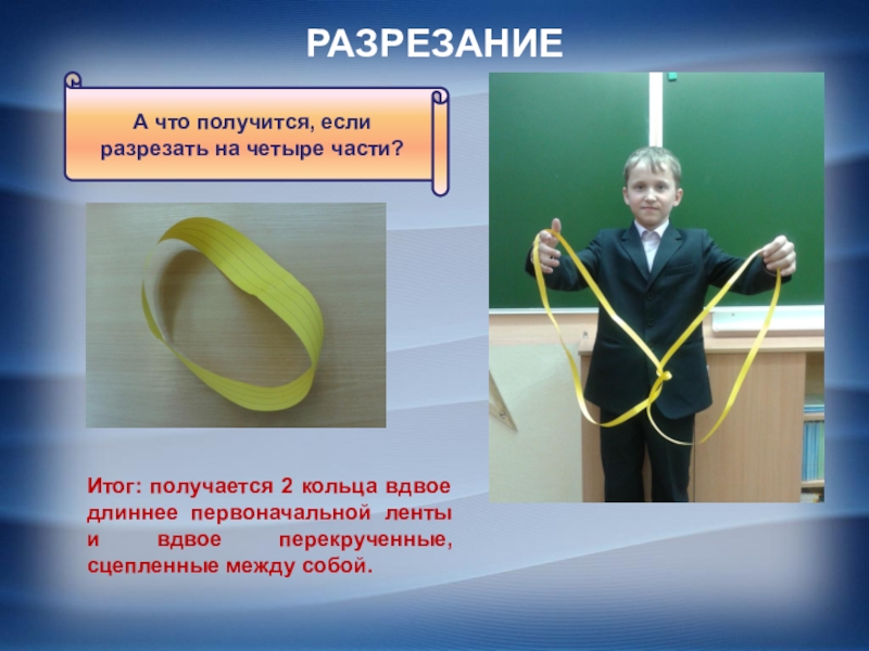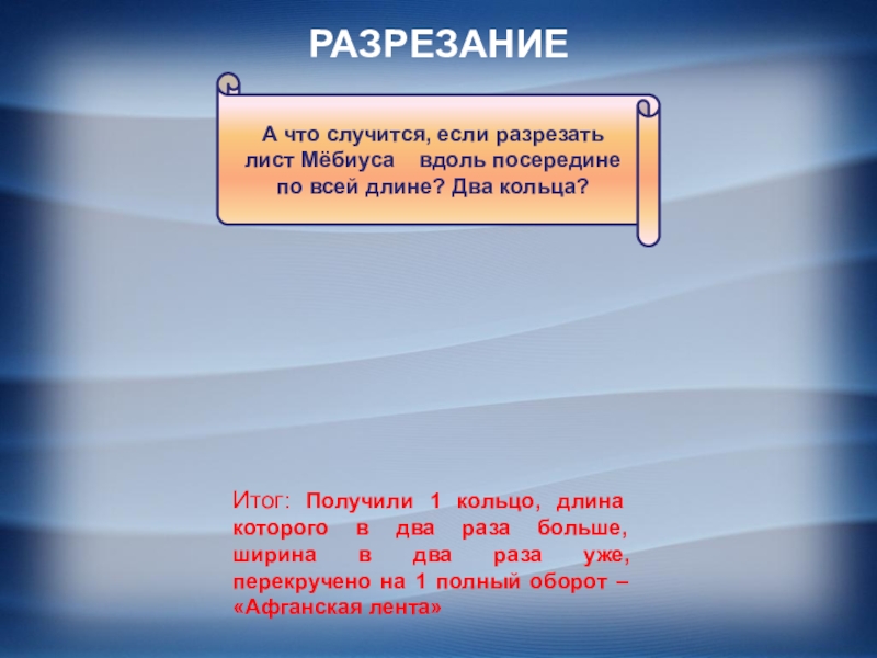 Итог: Получили 1 кольцо, длина которого в два раза больше, ширина в два раза уже, перекручено на 1 полный оборот – «Афганская лента»