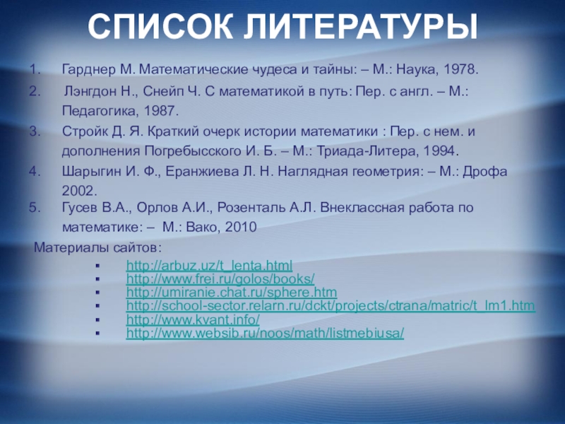 1. Гарднер М. Математические чудеса и тайны: ‒ М.: Наука, 1978.