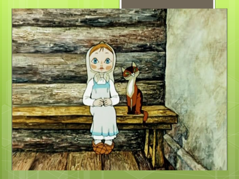 кошка бурая. Девчоночка маленькая и кошка маленькая и до того худая да ободранная, что редко кто такую в избу пустит. Девчоночка эту кошку гладит, а она до того звонко мурлычет, что по всей избе слышно.