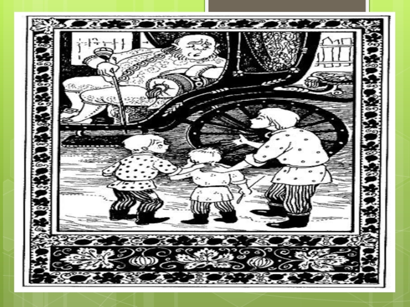 перед брюхом палку держит с золотым набалдашником. И углядел он у одной избы трое ребятишек играют, и все в сапогах.