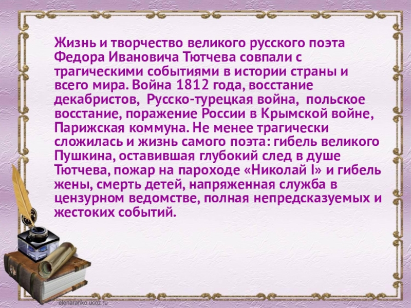 трагическими событиями в истории страны и всего мира. Война 1812 года, восстание декабристов, Русско-турецкая война, польское восстание, поражение России в Крымской войне, Парижская коммуна. Не менее трагически сложилась и жизнь самого поэта: гибель великого Пушкина, оставившая глубокий след в душе Тютчева, пожар на пароходе «Николай I» и гибель жены, смерть детей, напряженная служба в цензурном ведомстве, полная непредсказуемых и жестоких событий.