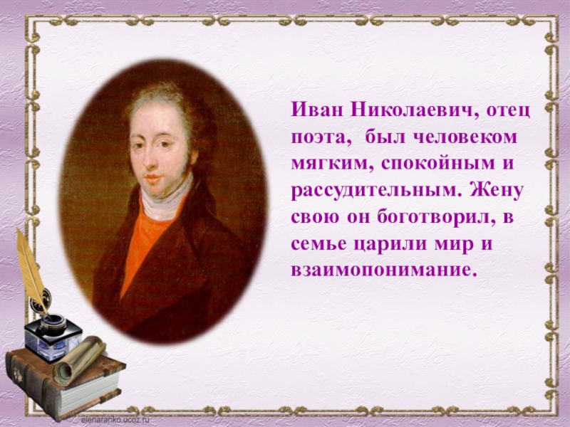 Слайд 6Иван Николаевич, отец поэта, был человеком мягким, спокойным и рассудительным. Жену