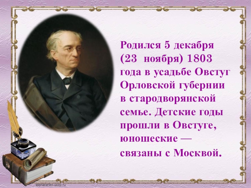 Слайд 3Родился 5 декабря (23 ноября) 1803 года в усадьбе Овстуг Орловской