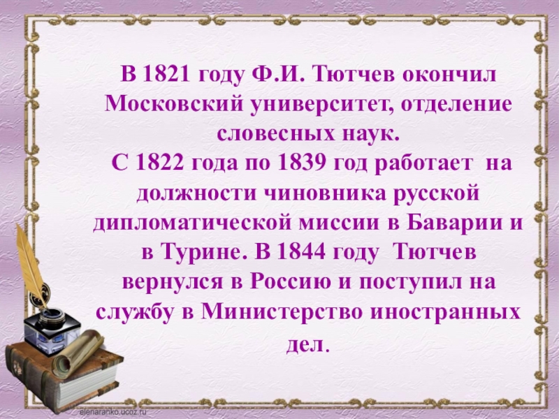 Слайд 12Жизнь и творчество великого русского поэта Федора Ивановича Тютчева совпали с