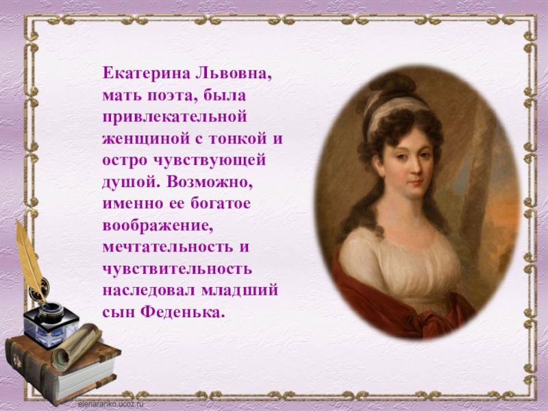 Слайд 5Екатерина Львовна, мать поэта, была привлекательной женщиной с тонкой и остро