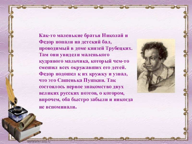 в доме князей Трубецких. Там они увидели маленького кудрявого мальчика, который чем-то смешил всех окружавших его детей. Федор подошел к их кружку и узнал, что это Сашенька Пушкин. Так состоялось первое знакомство двух великих русских поэтов, о котором, впрочем, оба быстро забыли и никогда не вспоминали.