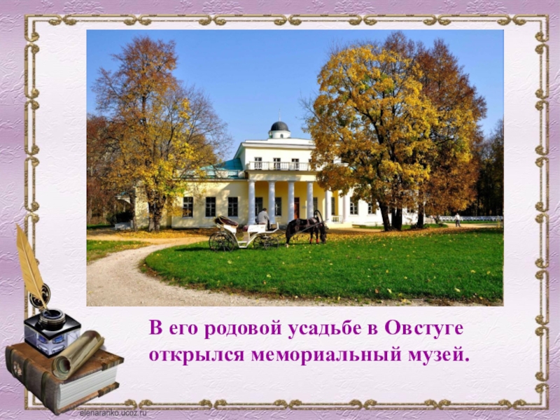 Слайд 15В его родовой усадьбе в Овстуге открылся мемориальный музей.