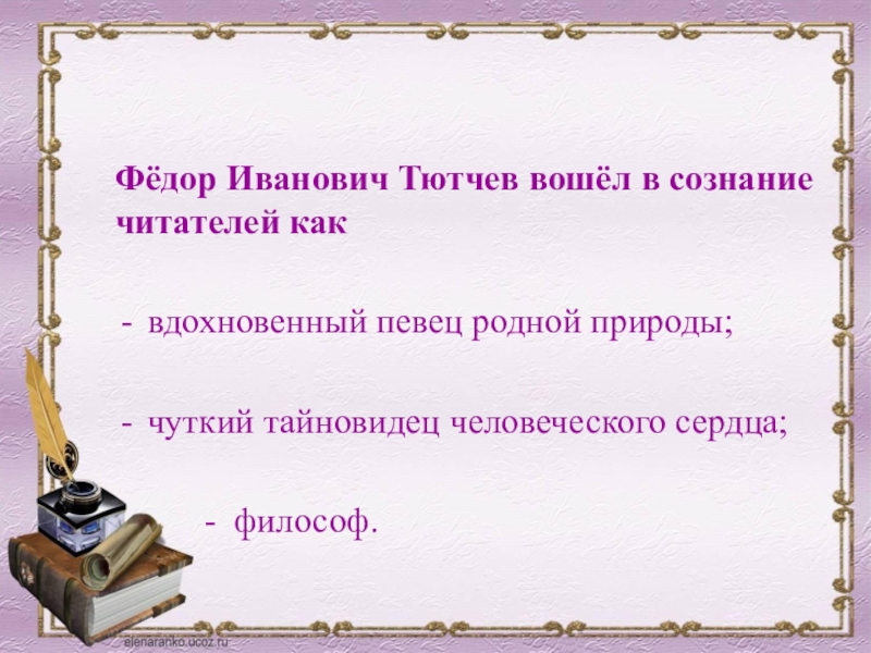 Слайд 17Фёдор Иванович Тютчев вошёл в сознание читателей как
