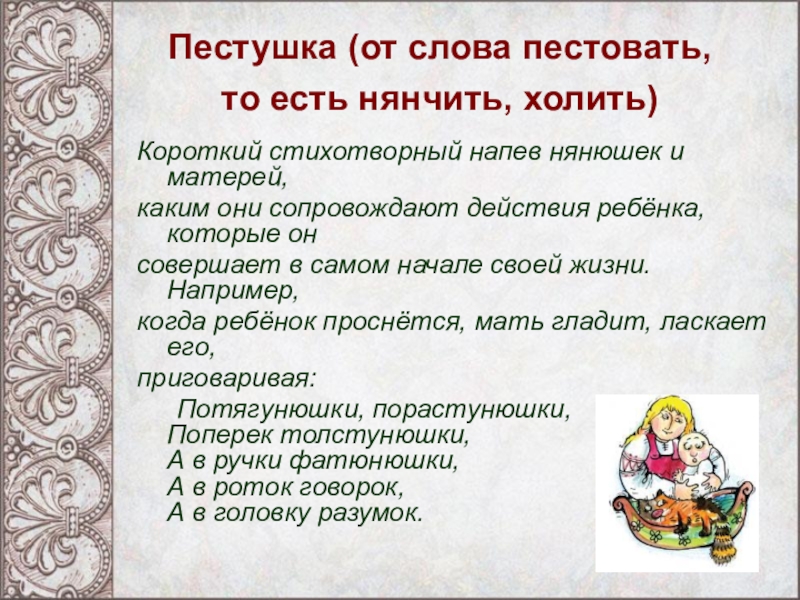 факт, что в нём сохранились элементы заговора-оберега. Люди верили, что человека окружают таинственные враждебные силы, и если ребёнок увидит во сне что-то плохое, страшное, то наяву это уже не повторится. Вот почему в колыбельной можно найти «серенького волчка» и других пугающих персонажей. Позже колыбельные песни утрачивали магические элементы, приобретали значение доброго пожелания на будущее. Итак, колыбельная песня — песня, с помощью которой убаюкивают ребёнка. Поскольку песня сопровождалась мерным покачиванием ребёнка, в ней очень важен ритм.