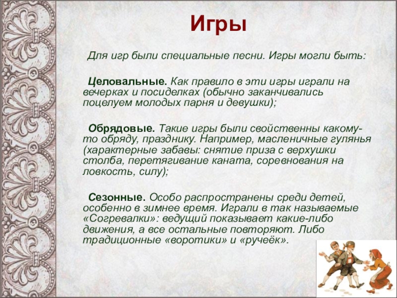 эти игры играли на вечерках и посиделках (обычно заканчивались поцелуем молодых парня и девушки);