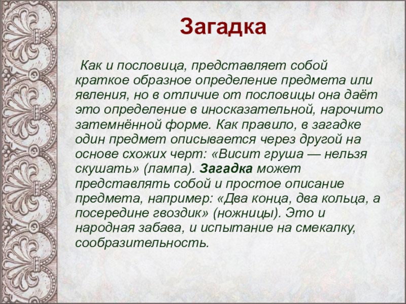 явления, но в отличие от пословицы она даёт это определение в иносказательной, нарочито затемнённой форме. Как правило, в загадке один предмет описывается через другой на основе схожих черт: «Висит груша — нельзя скушать» (лампа). Загадка может представлять собой и простое описание предмета, например: «Два конца, два кольца, а посередине гвоздик» (ножницы). Это и народная забава, и испытание на смекалку, сообразительность.
