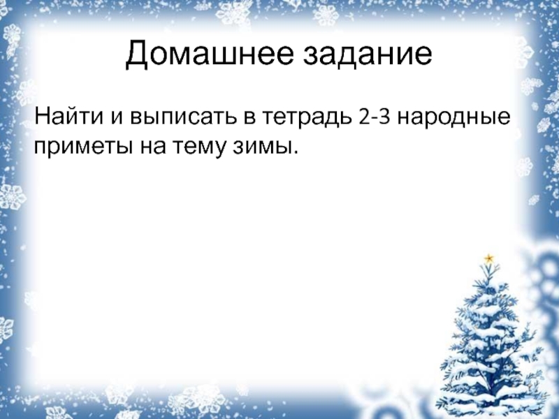 Домашнее заданиеНайти и выписать в тетрадь 2-3 народные приметы на тему зимы.