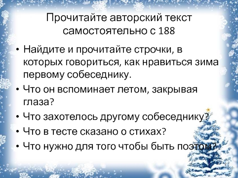 Прочитайте авторский текст самостоятельно с 188Найдите и прочитайте строчки, в которых говориться, как нравиться зима первому собеседнику.Что