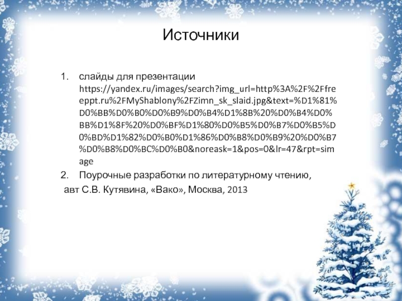 Источники   слайды для презентации https://yandex.ru/images/search?img_url=http%3A%2F%2Ffreeppt.ru%2FMyShablony%2FZimn_sk_slaid.jpg&text=%D1%81%D0%BB%D0%B0%D0%B9%D0%B4%D1%8B%20%D0%B4%D0%BB%D1%8F%20%D0%BF%D1%80%D0%B5%D0%B7%D0%B5%D0%BD%D1%82%D0%B0%D1%86%D0%B8%D0%B9%20%D0%B7%D0%B8%D0%BC%D0%B0&noreask=1&pos=0&lr=47&rpt=simageПоурочные разработки по литературному чтению, авт С.В. Кутявина, «Вако», Москва, 2013