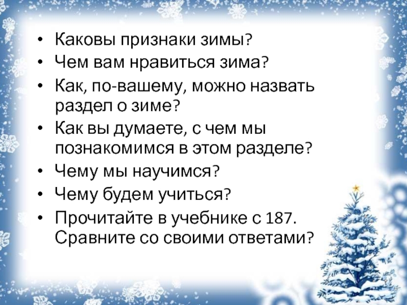 Каковы признаки зимы?Чем вам нравиться зима?Как, по-вашему, можно назвать раздел о зиме?Как вы думаете, с чем мы