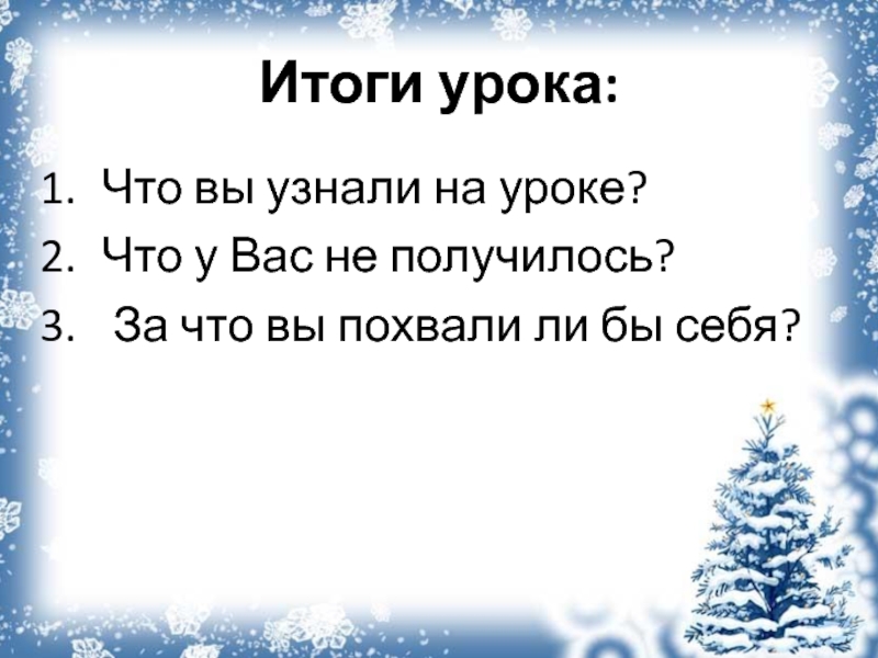 Итоги урока:Что вы узнали на уроке?Что у Вас не получилось? За что вы похвали ли бы себя?