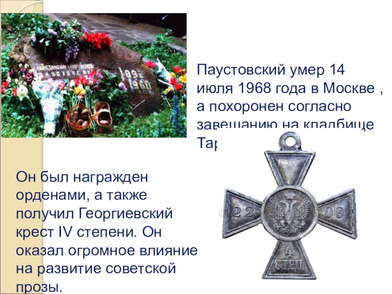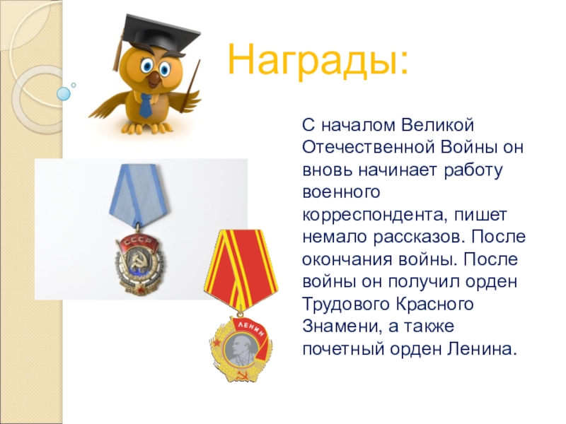Он был награжден орденами, а также получил Георгиевский крест IV степени. Он оказал огромное влияние на развитие советской прозы.