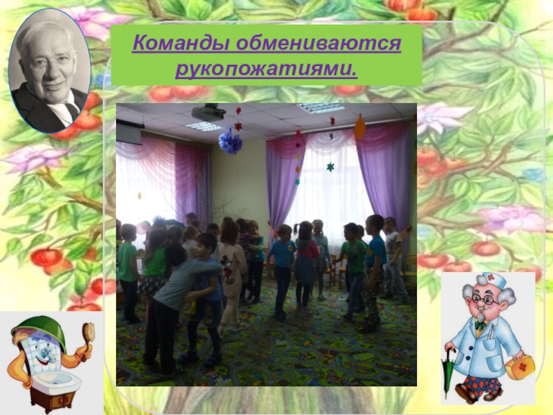 Слайд 15Команды обмениваются рукопожатиями.