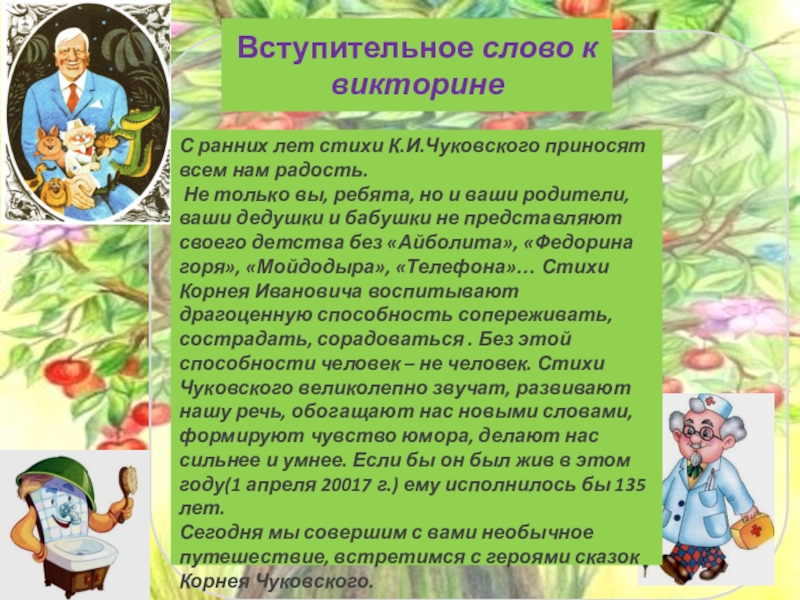 Не только вы, ребята, но и ваши родители, ваши дедушки и бабушки не представляют своего детства без «Айболита», «Федорина горя», «Мойдодыра», «Телефона»… Стихи Корнея Ивановича воспитывают драгоценную способность сопереживать, сострадать, сорадоваться . Без этой способности человек – не человек. Стихи Чуковского великолепно звучат, развивают нашу речь, обогащают нас новыми словами, формируют чувство юмора, делают нас сильнее и умнее. Если бы он был жив в этом году(1 апреля 20017 г.) ему исполнилось бы 135 лет.