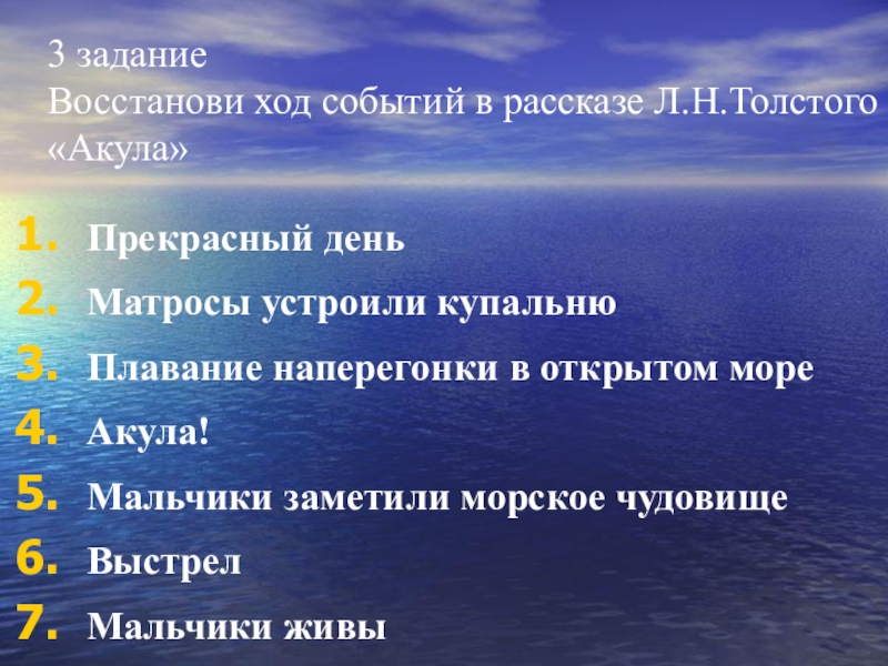 Восстанови ход событий в рассказе Л.Н.Толстого «Акула»
