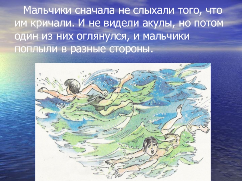 не видели акулы, но потом один из них оглянулся, и мальчики поплыли в разные стороны.