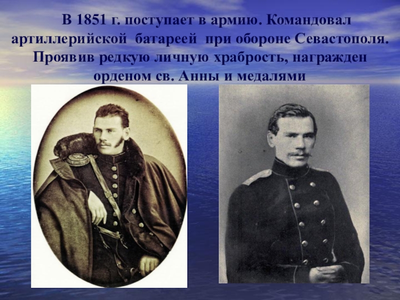 Слайд 16 В 1851 г. поступает в армию. Командовал артиллерийской батареей
