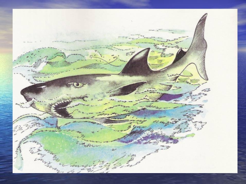распугивает и уничтожает рыбу, рвет сети, иногда нападает на людей. Акула – страшная хищница моря… Пасть в нижней части головы акулы, похожа на узкую поперечную щель, и вся она усажена несколькими рядами острых зубов. Кожа многих акул покрыта чешуёй с острыми шипами. Поэтому даже легкое прикосновение акулы, плывущей порой со скоростью 40 км в час, наносит серьезные раны. Акулы откладывают крупные икринки, покрытые кожистой скорлупой, или рождают живых детенышей. Не все акулы хищники. Многие питаются планктоном, медузами, мелкой рыбешкой»