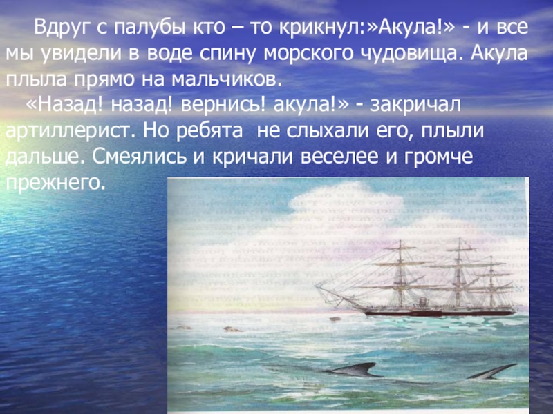- и все мы увидели в воде спину морского чудовища. Акула плыла прямо на мальчиков.