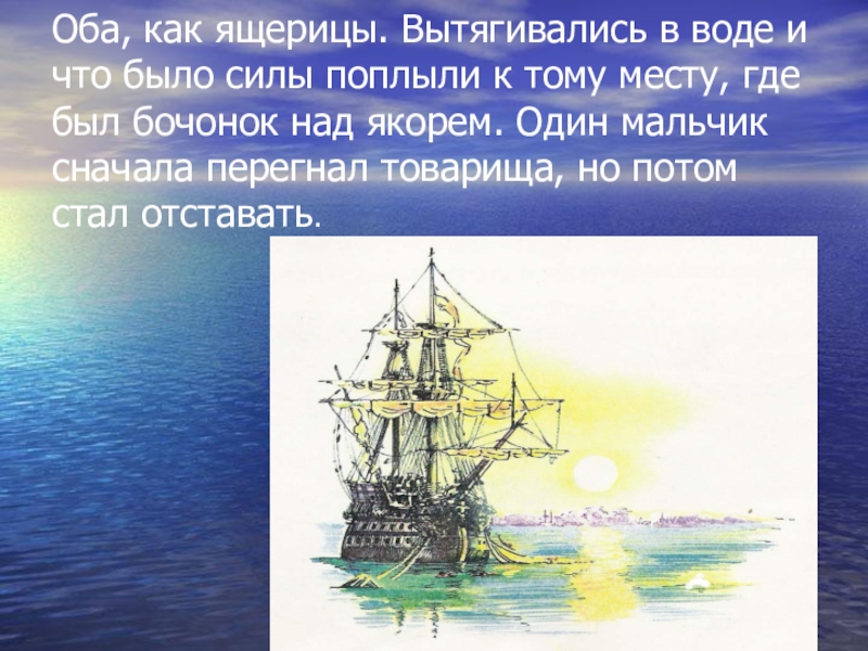 Слайд 28Оба, как ящерицы. Вытягивались в воде и что было силы поплыли
