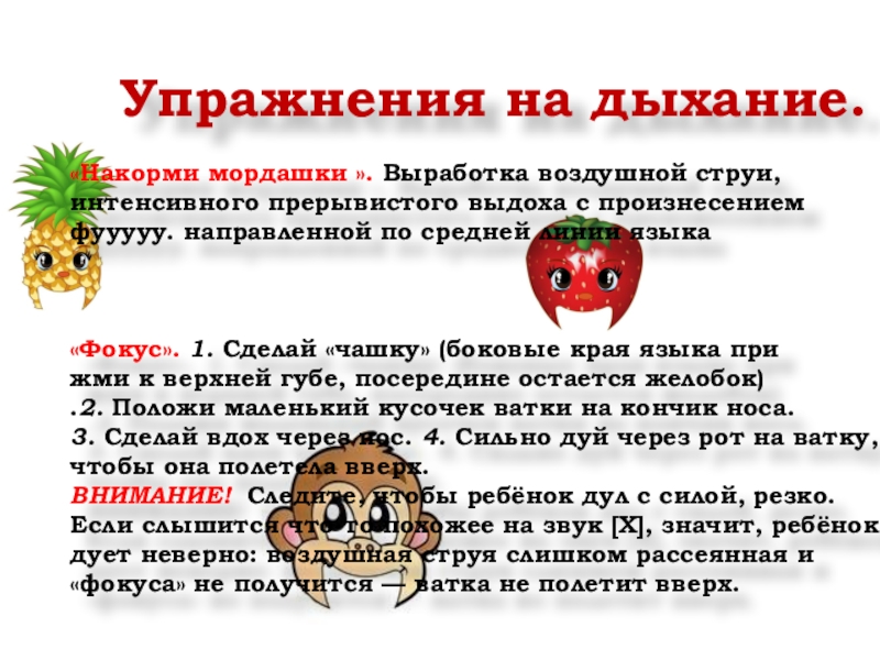 ВНИМАНИЕ! Следите, чтобы ребёнок дул с силой, резко. Если слышится что-то похожее на звук [X], значит, ребёнок дует неверно: воздушная струя слишком рассеянная и «фокуса» не получится — ватка не полетит вверх.