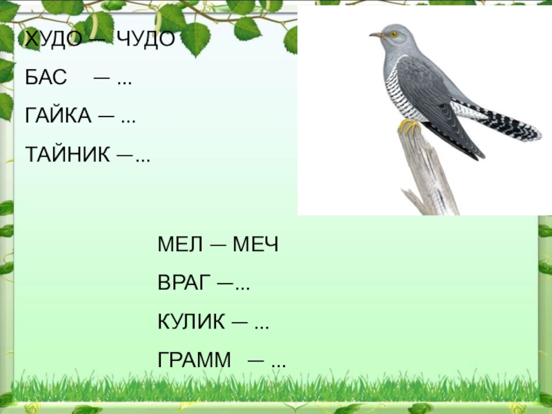 ХУДО — ЧУДОБАС   — ...ГАЙКА — ... ТАЙНИК —...  МЕЛ — МЕЧ  ВРАГ