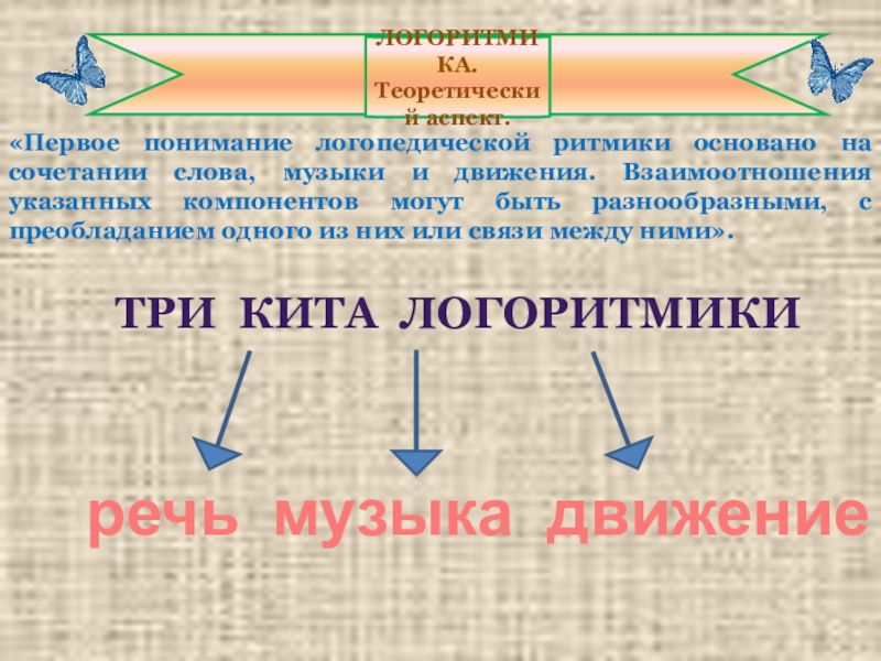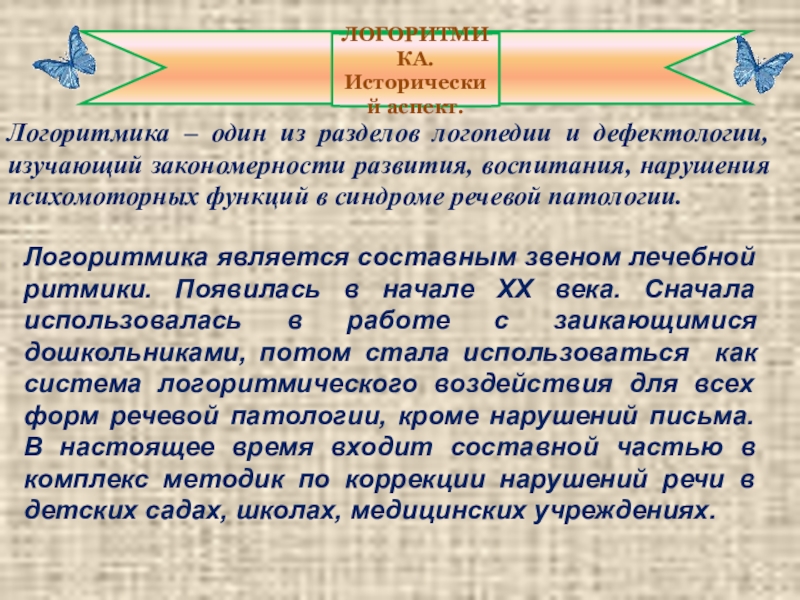 Логоритмика является составным звеном лечебной ритмики. Появилась в начале XX века. Сначала использовалась в работе с заикающимися дошкольниками, потом стала использоваться как система логоритмического воздействия для всех форм речевой патологии, кроме нарушений письма. В настоящее время входит составной частью в комплекс методик по коррекции нарушений речи в детских садах, школах, медицинских учреждениях.