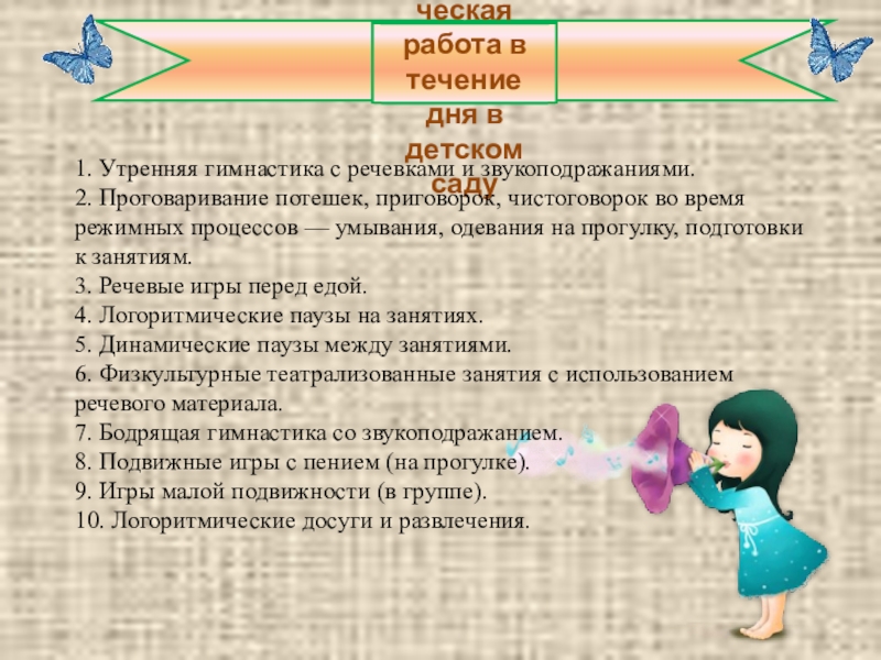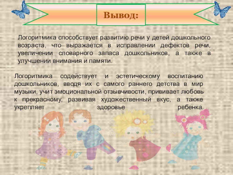 Логоритмика содействует и эстетическому воспитанию дошкольников, вводя их с самого раннего детства в мир музыки, учит эмоциональной отзывчивости, прививает любовь к прекрасному, развивая художественный вкус, а также укрепляет здоровье ребенка.