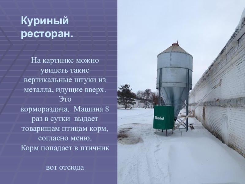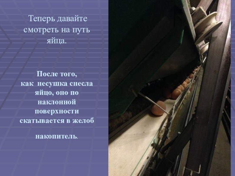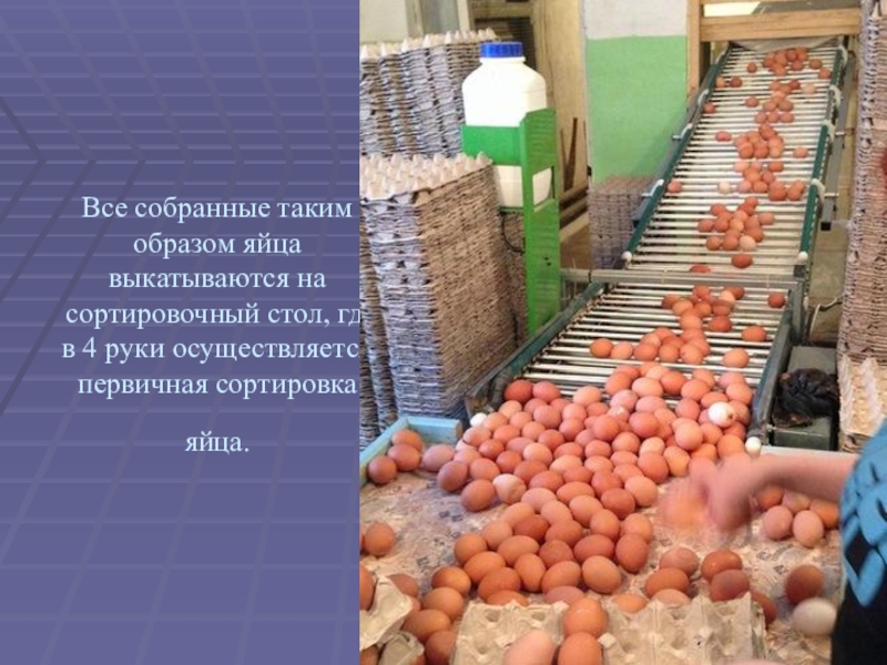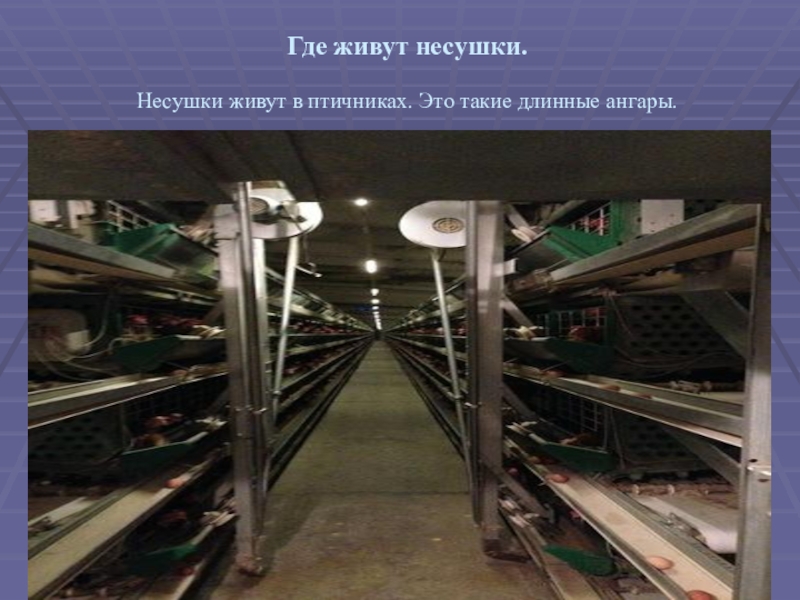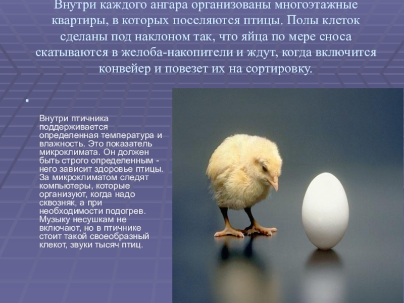 Внутри птичника поддерживается определенная температура и влажность. Это показатель микроклимата. Он должен быть строго определенным - него зависит здоровье птицы. За микроклиматом следят компьютеры, которые организуют, когда надо сквозняк, а при необходимости подогрев. Музыку несушкам не включают, но в птичнике стоит такой своеобразный клекот, звуки тысяч птиц.