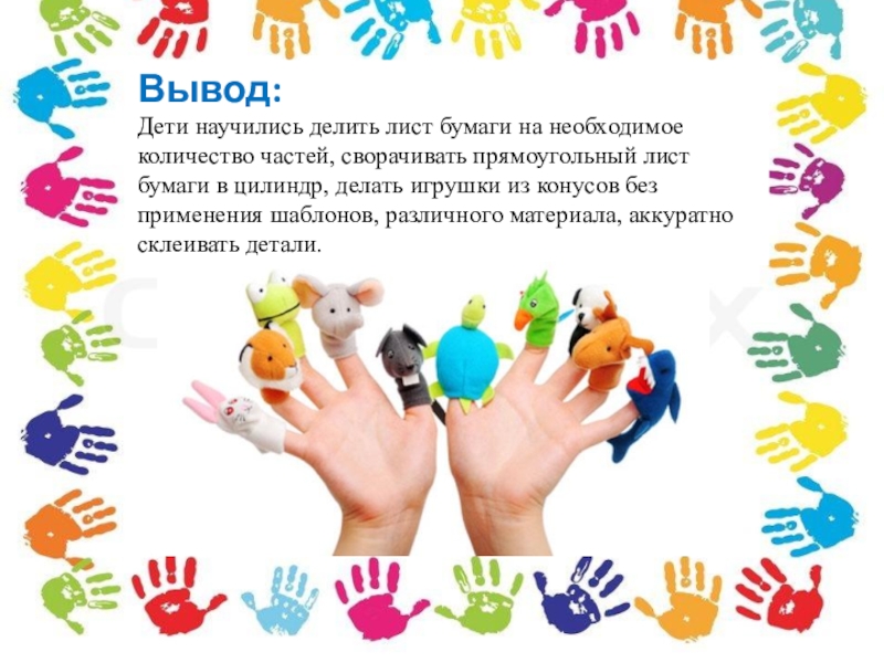 Вывод:Дети научились делить лист бумаги на необходимое количество частей, сворачивать прямоугольный лист бумаги в цилиндр, делать игрушки